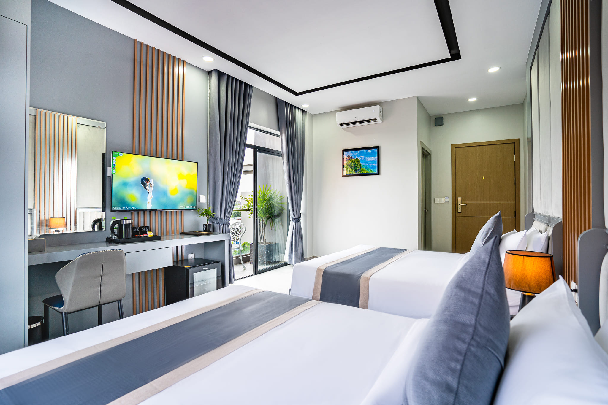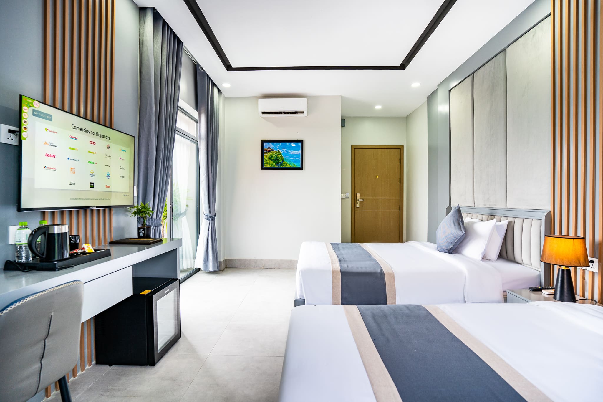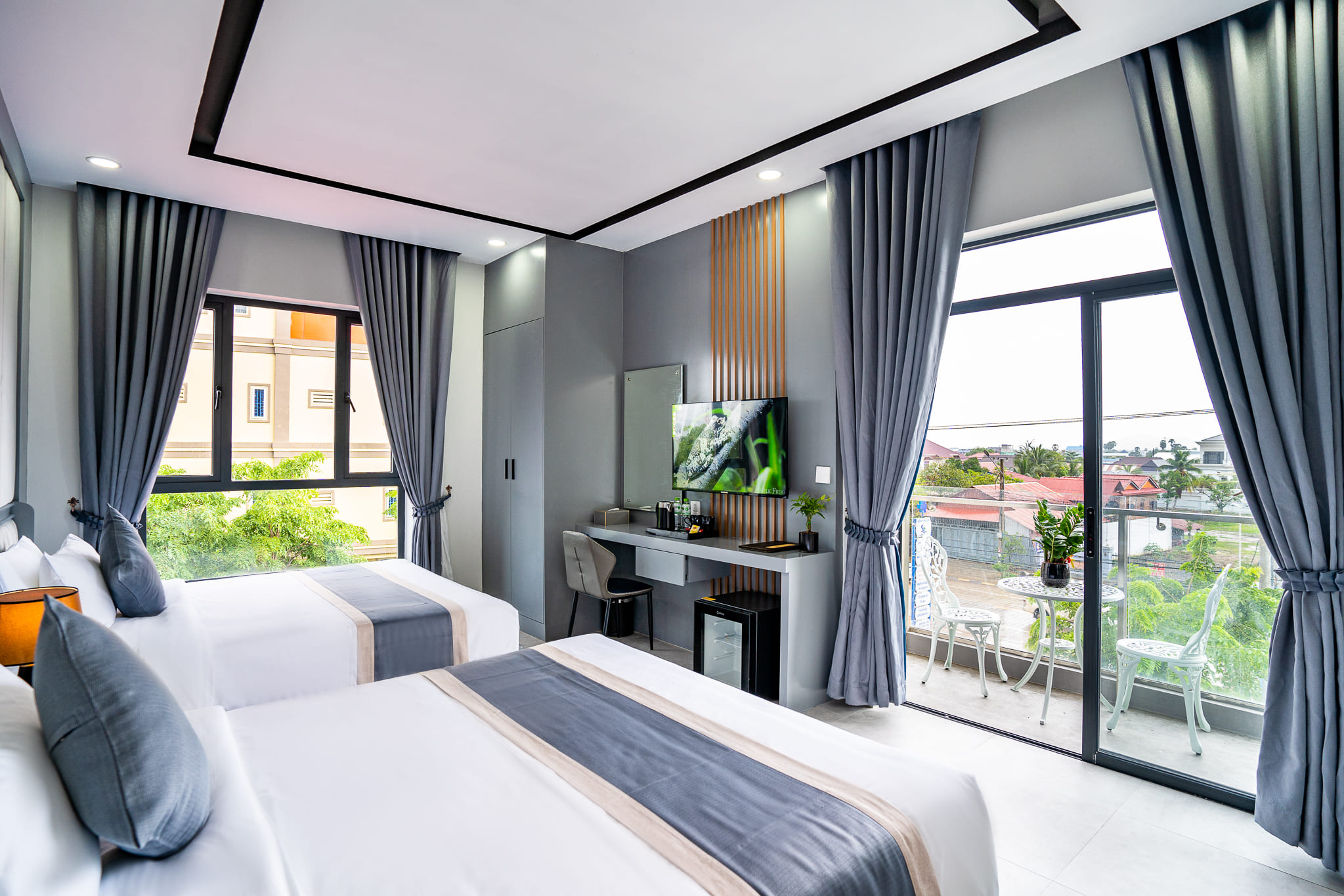 Our room size 30square matter and bed size 1.60metter x 2metter, offers elegant comfort and modernity, beautiful decoration Khmer-Asian style, and European quality bed are highlights. Bathroom feature a large rain shower with cool and hot water, complimentary hotel-brand toiletries, and white-clean all amenities each room, overlooks a private balcony with city and mountain view.